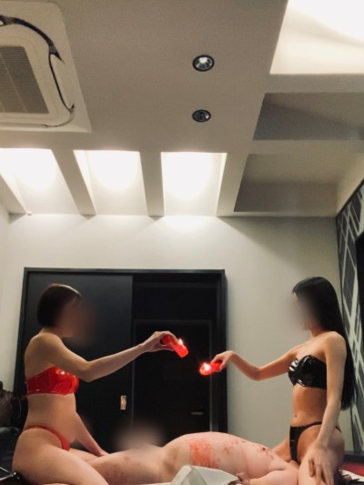 その後、Gをベッドに寝かせ、顔に私が跨り、足にあすか女王様が跨り、2人同時に蝋燭を垂らす。